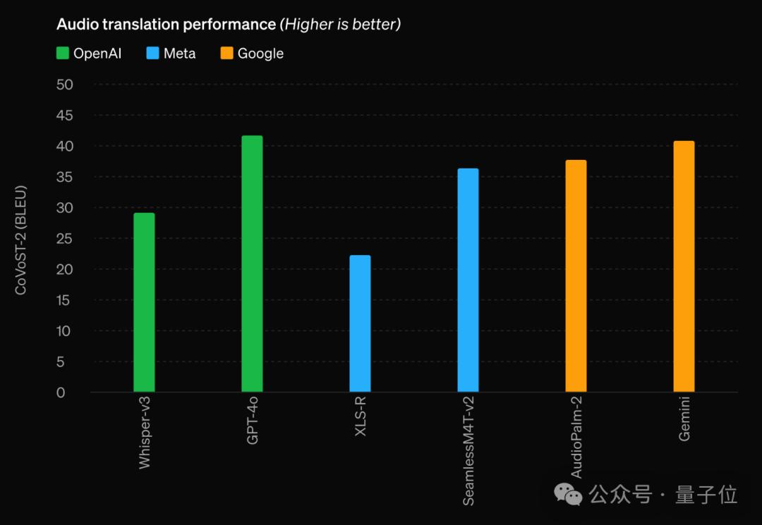 GPT-4o则是跨文本、视觉和音频端到端训练的新模型,这意味着所有输入和输出都由同一个神经网络处理。在语音翻译任务上,强于OpenAI专门的语音模型Whisper-V3以及谷歌和Meta的语音模型。