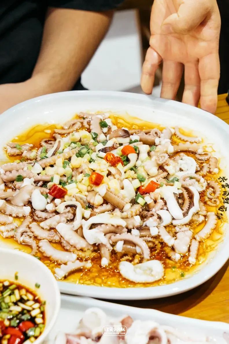 "果然新鲜才是王道,鲜得都快跳嘴里了。" 焯水淋油,一气呵成,朴素的做法更考验食材的新鲜度。这道菜只取八爪鱼的触须,厨房里速战速决,油滋滋冒气着就迅速上桌了,火候拿捏程度了得。不那么喧宾夺主的葱油,反而让海洋鲜味大放异彩。弹嫩脆爽,嚼劲十足,是不是鲜活货色,下嘴那刻就有了定论。共富海鲜面馆(智慧湾店)
