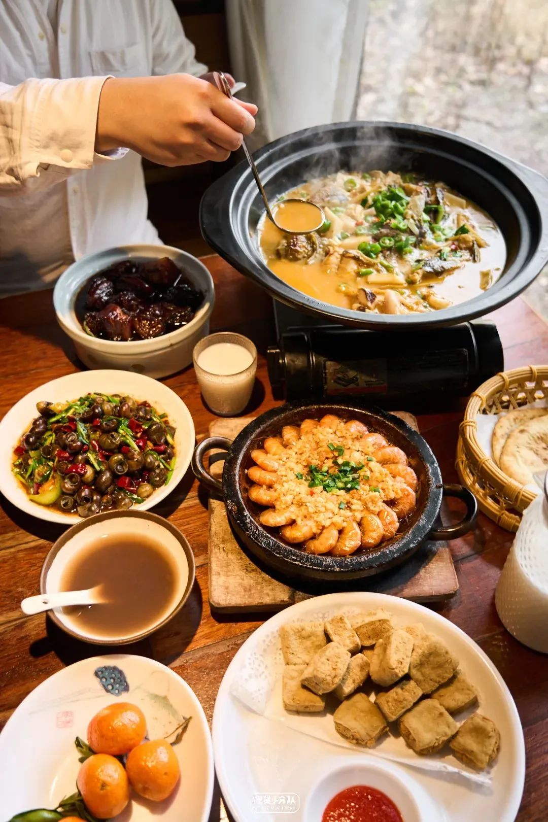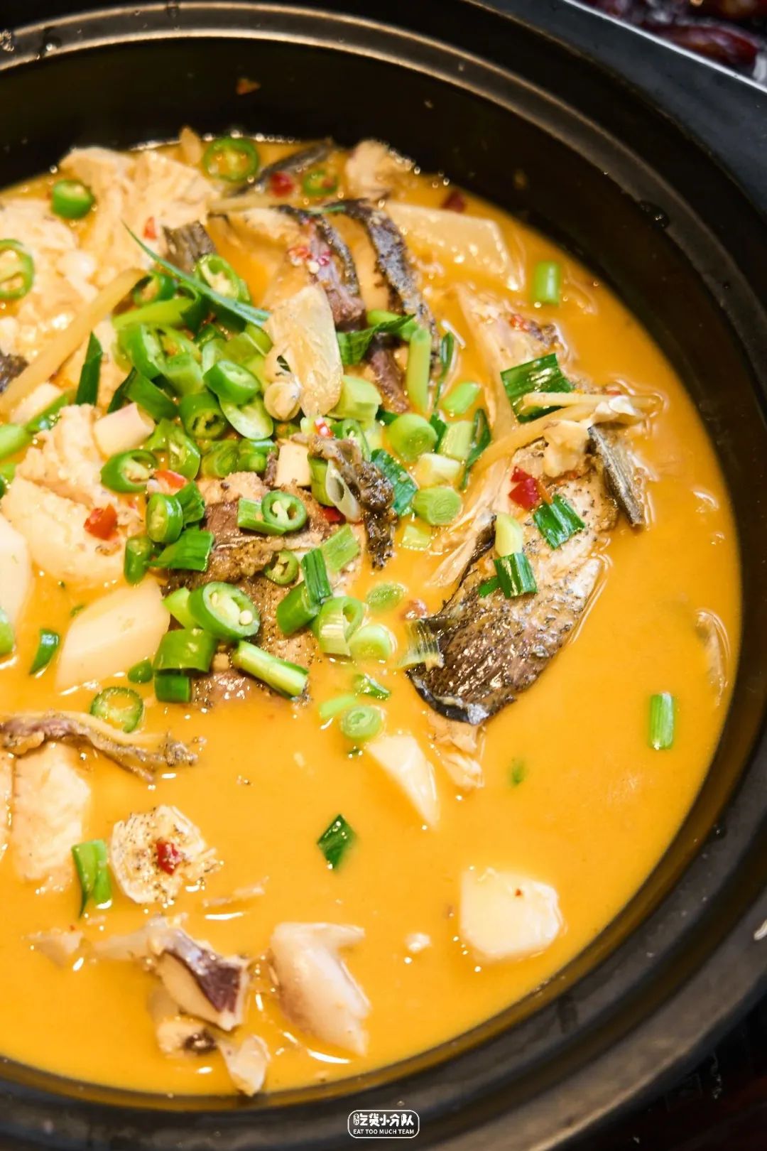 用水缸里活蹦乱跳的大鲢鱼做,按份点,1份950g。用大开口砂锅、以家烧的做法慢熬40分钟,待鱼肉煮出胶质后出锅。这时候的汤汁是牛奶质地,粘稠糊嘴,相当诱人。鱼肉鲜甜肥美,配菜更绝,能感觉到厨房火力很猛,连年糕都能入味三分。恰到好处的微辣做法,让舌尖接触鱼肉瞬间胃口大开。柴火豆腐嘛煮烂掉再去吃它。汤底偏咸不建议单喝,泡饭贼香。农家菜老大