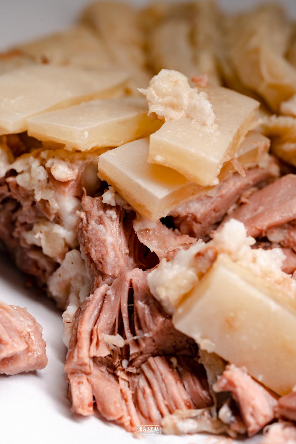 羊肉挑选的是两周岁以上的青壮年纯种山羊,每只净重100斤左右,当天屠宰,当天加工,次日售卖。烂糊羊肉中的佼佼者,不需要用咬的,整块肉呈现出近乎融化掉的状态,只用盐做调味,细糯绵软,吃起来有淡淡奶香味。腿肉精瘦,而大排肉会有更多脂肪层,口感最软且味道更足。羊肉都是现场切的,保留了用纸包羊肉的习惯,连皮带肉能吃出果冻的口感,上了年纪的食客吃着也毫不费力。黄大哥祖传羊肉