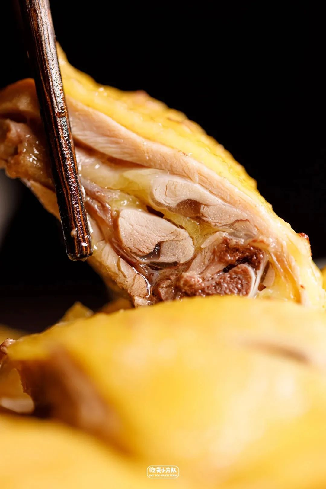 广东人对于鸡的料理,精细而刁钻,比起白斩鸡在烫煮时,一部分的精华会流失到汤水里,隔水蒸的做法,底下会留1摊晶莹剔透的金油,更像是把肉的香醇浓缩后,再从中剥离出来。放在蒸炉隔层,靠炙热的蒸汽一点点把鸡煨熟,80分钟后揭盖取鸡,切好装盘,再把蒸出来的油水淋回皮肉上。入口吃不出鸡腥,反而香气扑鼻。肉质紧致回弹,皮又脆又弹,容易柴的胸肉部分也是嫩滑多汁,腿肉和其他部分更是绝绝子缘梦轩