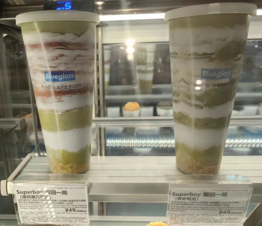 5月11日,在Blueglass线下门店看到,Blueglass推出的薄荷黑巧蜜瓜和薄荷蜜瓜这两种新品,标注“特别使用:玛咖、肉苁蓉、黄精、人参、鹿鞭、牡蛎肽、蛹虫草、牛磺酸、小桔袋”,并宣称有“3000亿活性益生菌/杯”“18种维生素矿物质”。而这款充满中药的新品销售价49元/杯。