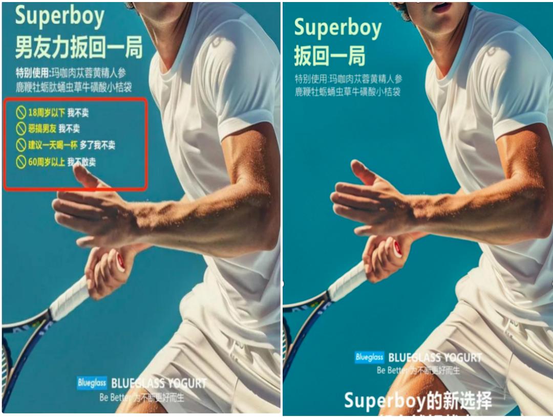 5月5日,“Blueglass新品广告被指擦边”一话题引发热议。据报道,酸奶品牌Blueglass的“Superboy男友力扳回一局”两款产品在广告中标注有“18禁”符号,并写有“男友力扳回一局”“18周岁以下我不卖”“哈哈哈哈哈,别说你不懂”“恶搞男友我不卖”“建议一天喝一杯多了我不卖”“60周岁以上我不敢卖”等标语。针对Blueglass新品广告是否存在擦边等问题,中国食品安全网向Blueglass品牌部发送邮件询问相关问题,截至发稿,暂未收到任何回复。