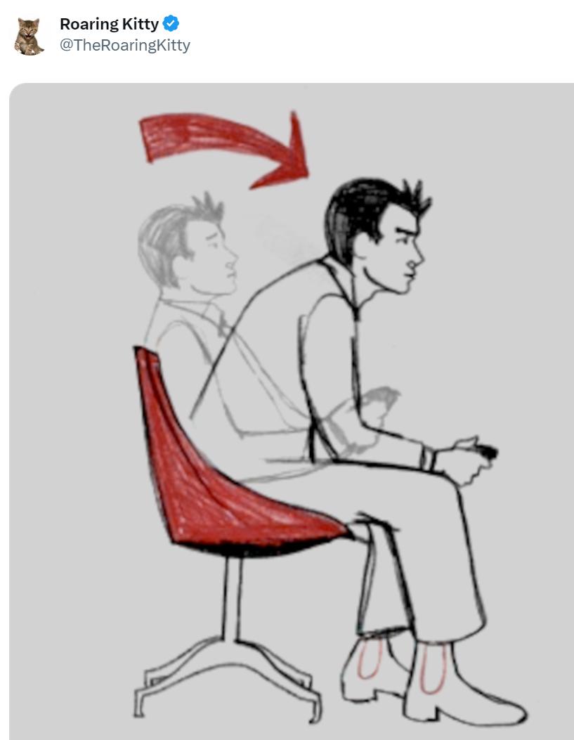 Keith Gill在网上重新出现,并发布了一张神秘的图片,图片显示一名男子坐在椅子上,身体前倾,于是就引发了一场散户抱团股的购买热潮!
