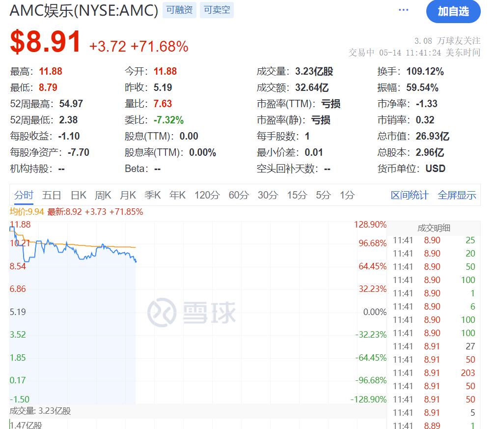而游戏驿站的暴涨,也带动了当年的一起暴涨的散户抱团股。另一个当年的主角——AMC娱乐也同样引来了大量的投资者。消息面上,AMC院线宣布已完成此前宣布的公开发售股票,以3.45美元的平均价格出售7250万股股票,筹集资金总额约2.5亿美元。
