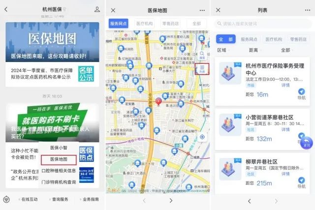 为了让市民实现掌上一键查询,前期,市医疗保障局发动全市各级医保经办力量,共同绘制“医保地图”。杭州各区、县(市)医保部门收集、整理辖区内服务网点、医药机构信息后,通过数据共享、人工导入等方式,运用技术手段转换为经纬度坐标,将这些信息导入“医保地图”,实现全市覆盖。参保人员只要关注“杭州医保”微信公众号,点击“查询服务”,进入“医保地图”后点击右侧“列表”,就可以直观找到离自己最近的经办机构、定点药店和定点医院等。