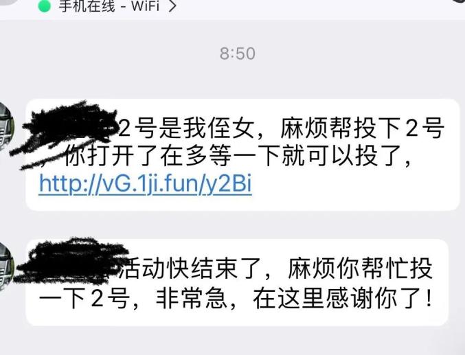 病毒首先是以给自己的侄女投票,以乞求的口吻发给所有好友,而且间断着不停发,这时候大家就会出于同情心点开链接进行投票。首先会发送:“***2号是我侄女,麻烦帮投下2号,你打开了在多等一下就可以投了。”