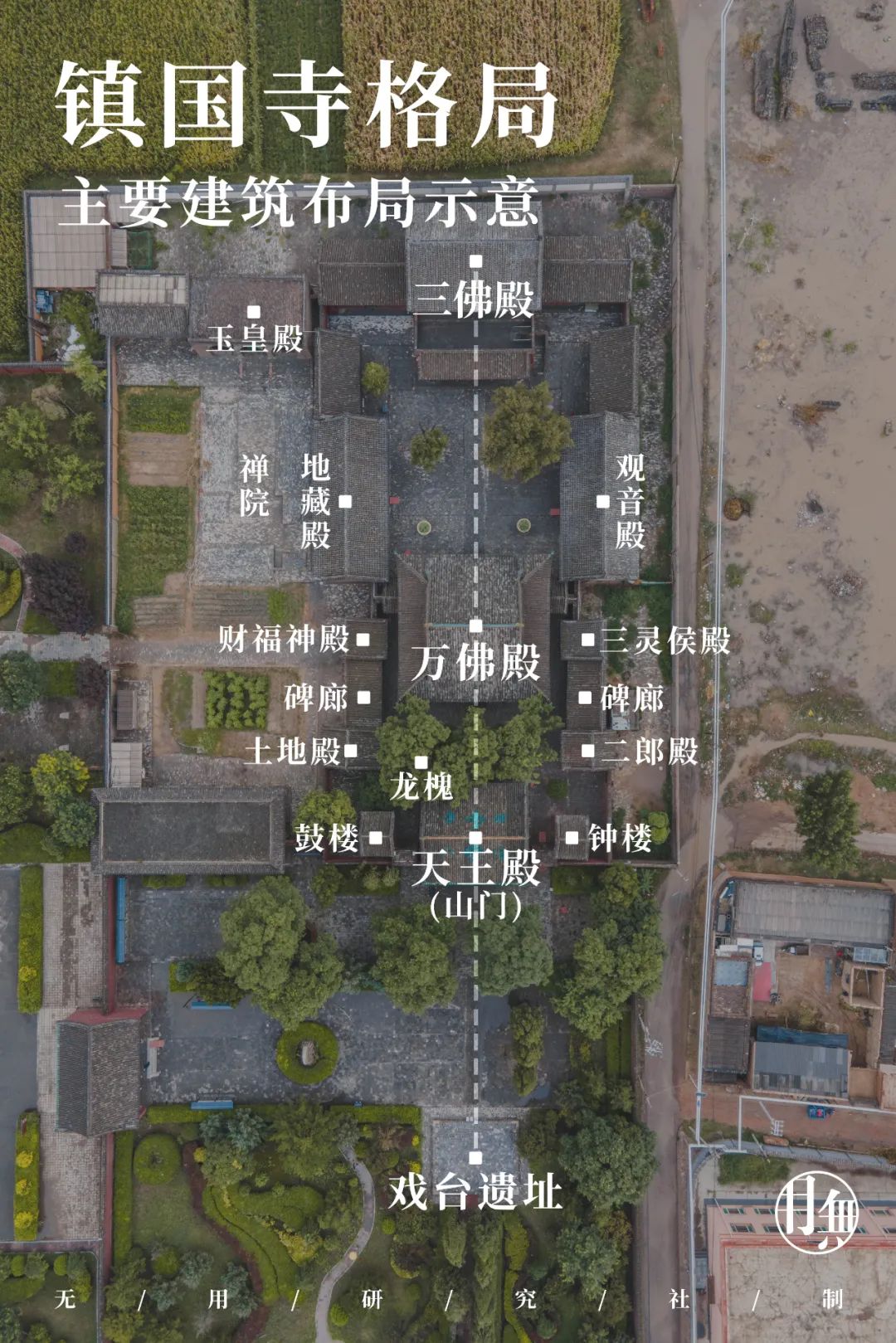 整个庙宇坐北朝南,中部为寺院主轴线,西侧为禅院,东侧为真武庙遗址,寺庙南侧还留有倒坐戏台遗址。