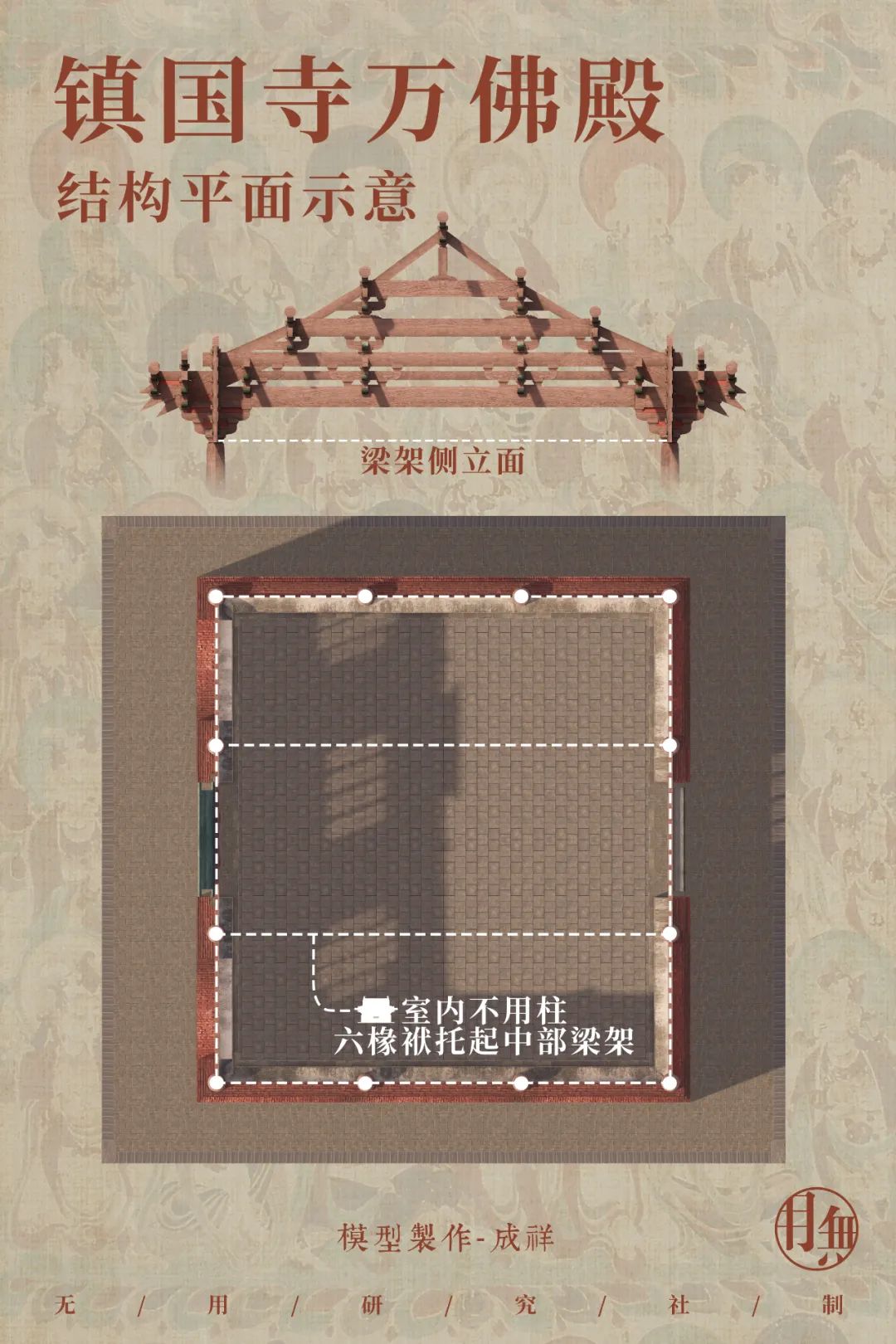 东侧六椽袱镇国寺万佛殿采用彻上露明造的双栿结构,取消殿内天花,将原本在天花上部的草栿暴露出来形成上道梁栿,可以看做是唐代殿堂型构架的延续,体现了五代时期北汉的官式建筑做法。