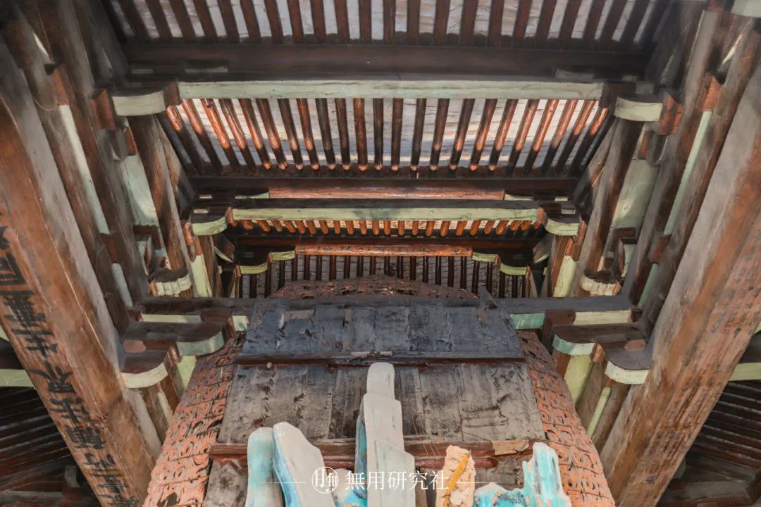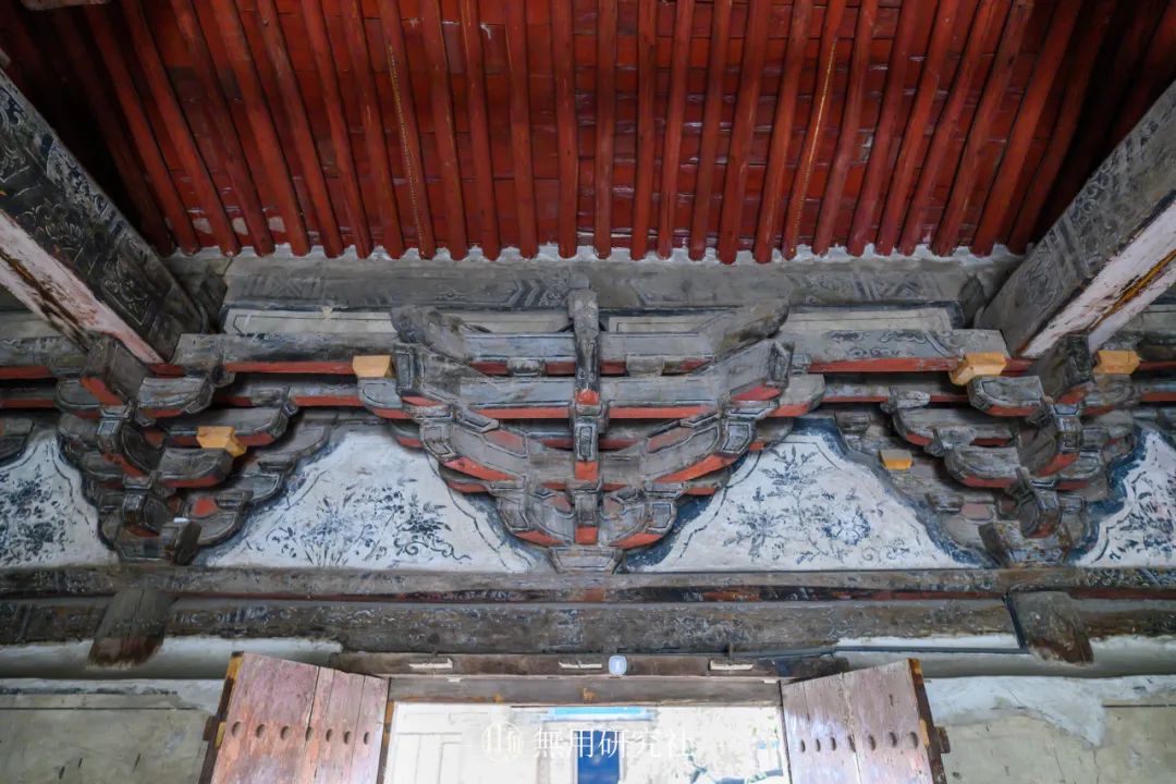 后侧梁架六椽栿之上施四椽袱、平梁,四椽栿之上用托脚承平槫,平梁之上用叉手、侏儒柱支撑承托脊槫,上下梁架之间采用襻间枋及斗栱进行承接。