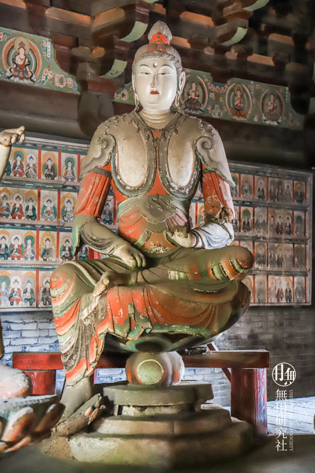 外侧拱眼壁佛像莲花彩画内檐栱眼壁上绘有12处菩萨坐像与莲花纹样,每处栱眼壁中绘有4个菩萨,共计48个。可谓是满绘万佛于一殿,周显庄严。