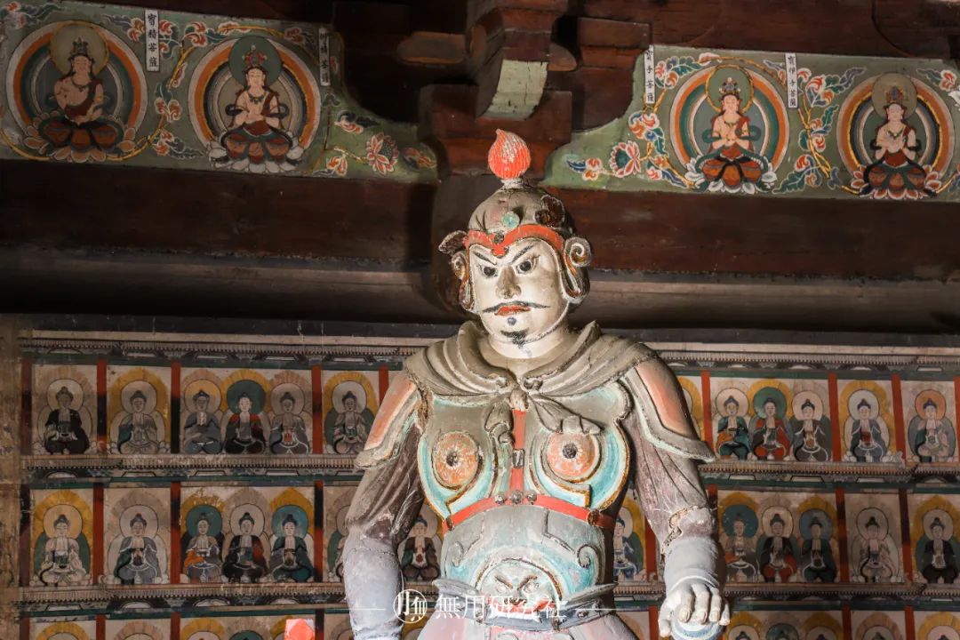 三佛殿胁侍菩萨 摄影:郝天真殿外,两山墙外侧同样有两大幅形似武士的壁画,画中人物怒目圆睁,形象摄人心魄,画工细腻。