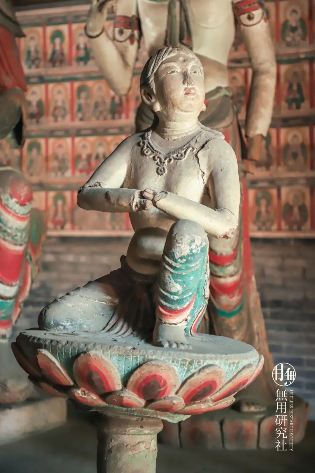 自在坐观音两侧为善财童子和龙女侍奉,右侧龙女像已损毁,左侧善财童子双手合十,身体微微前倾。