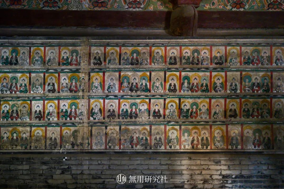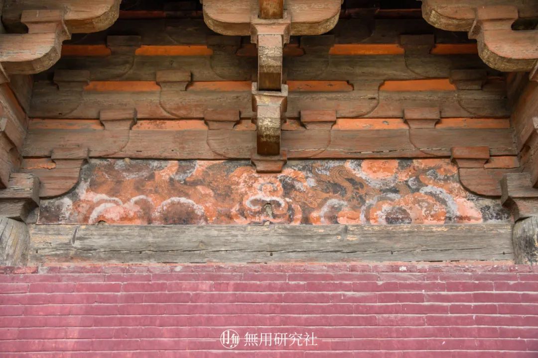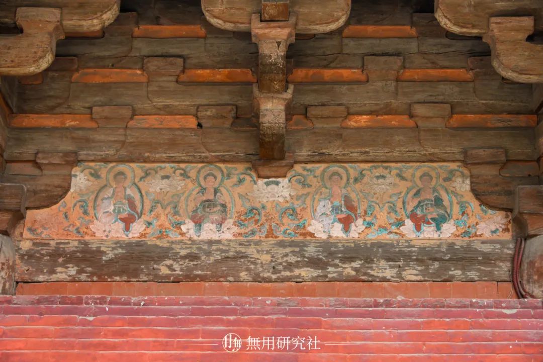 大殿内壁万佛壁画其中万佛殿南北立面外檐栱眼壁上绘有佛像与莲花纹样,东西立面外檐的栱眼壁则绘有六处墨龙图案。