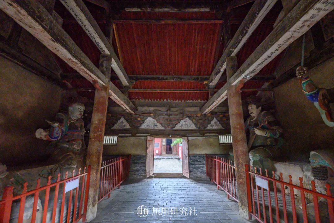 天王殿前倒坐戏台遗址中轴线上从南到北依次为戏台(遗址)、天王殿(山门)、万佛殿和三佛殿,天王殿两侧有钟鼓楼,其格局与我们先前介绍的榆次雨花宫相似。