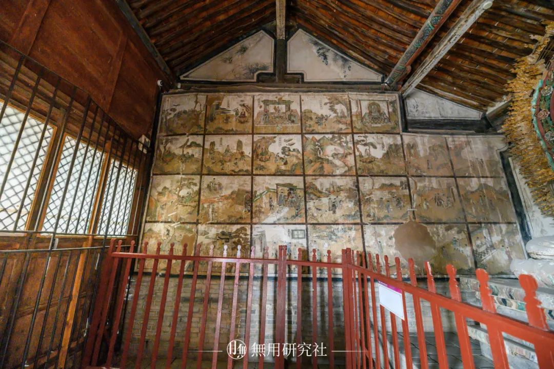 三佛殿侧面结构殿内保存了《释氏源流应化事迹》经典为基础的佛传故事壁画52幅,彩塑7尊,共同营造出了三佛楼的佛教文化氛围。其中52幅壁画分列山面两侧,至今依然保存清晰,左右呼应。