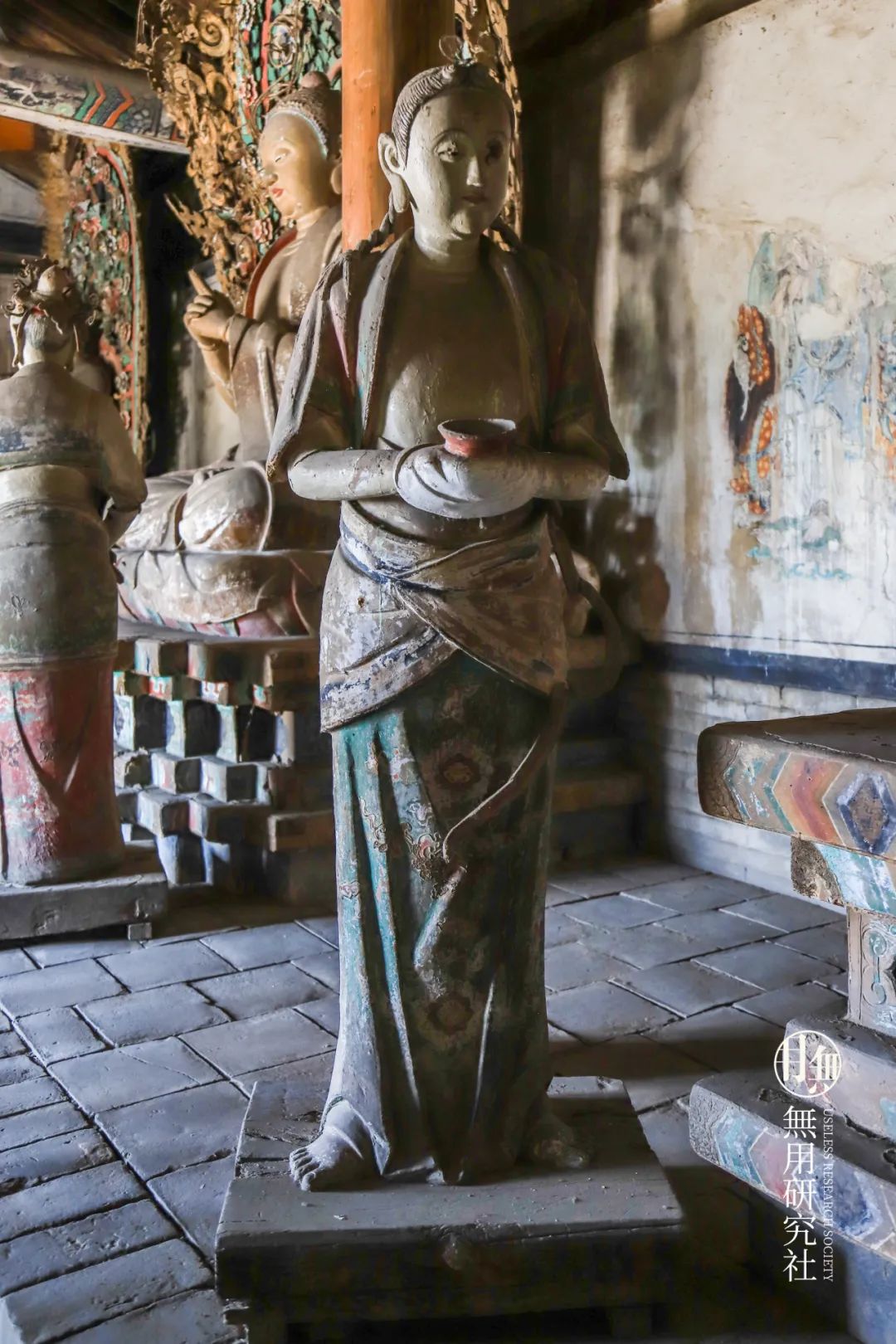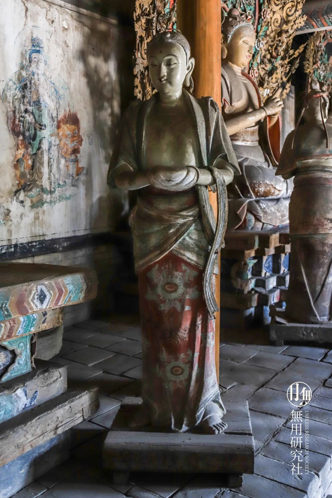 除此之外,在大殿前墙内壁两侧有壁画两幅,分绘人物画像,为文殊与普贤菩萨化身。