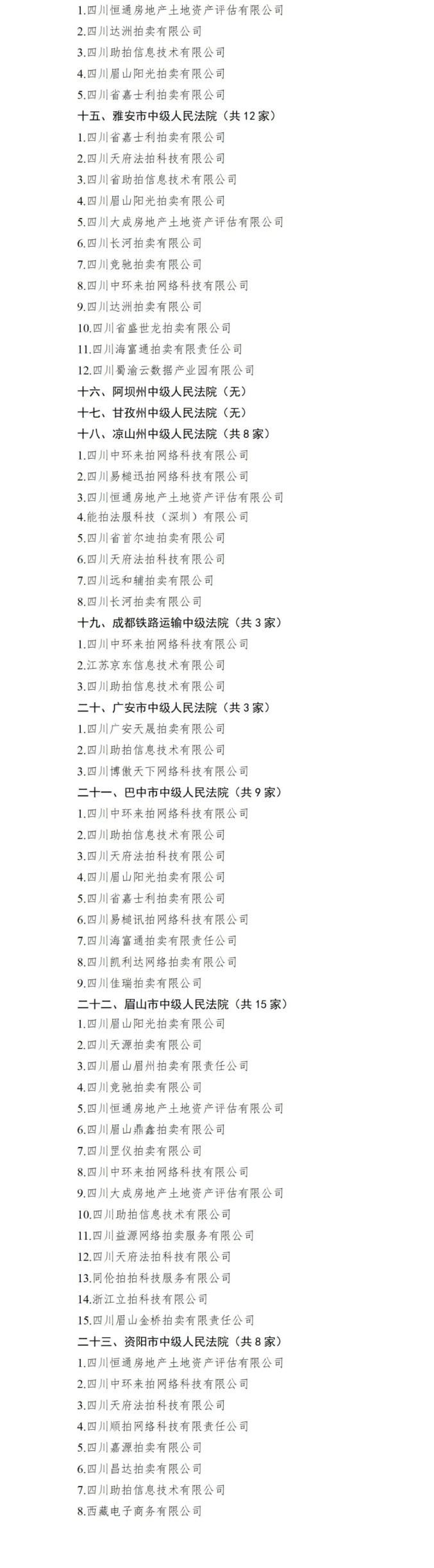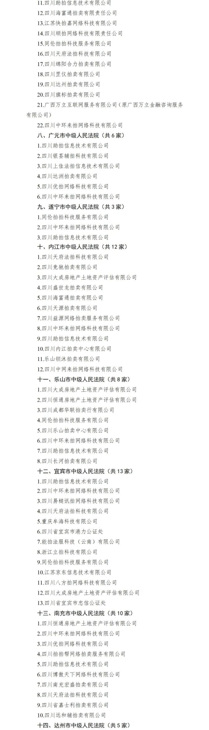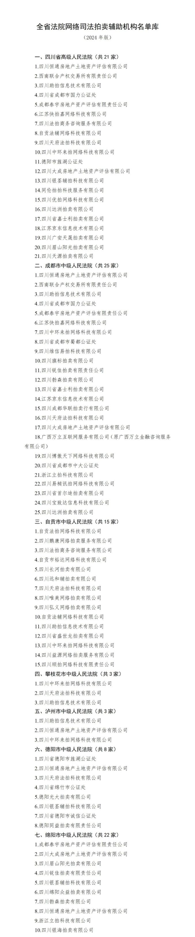 为进一步规范网络司法拍卖工作,根据《最高人民法院关于人民法院网络司法拍卖若干问题的规定》和《四川省高级人民法院关于网络司法拍卖辅助工作管理办法(试行)》等规定,现面向社会公开发布全省法院网络司法拍卖辅助机构名单库(2024年版),原2020年9月公布的四川省高级人民法院网络司法拍卖辅助工作机构名单库和四川省各中级人民法院网络司法拍卖辅助工作机构名单库自公布之日起失效。