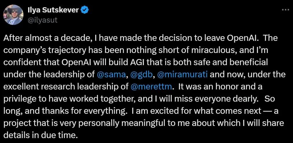 万万没想到,OpenAI联合创始人,首席科学家Ilya Sutskever在网上销声匿迹几个月后的首次回归,竟然是官宣了自己的离职消息。