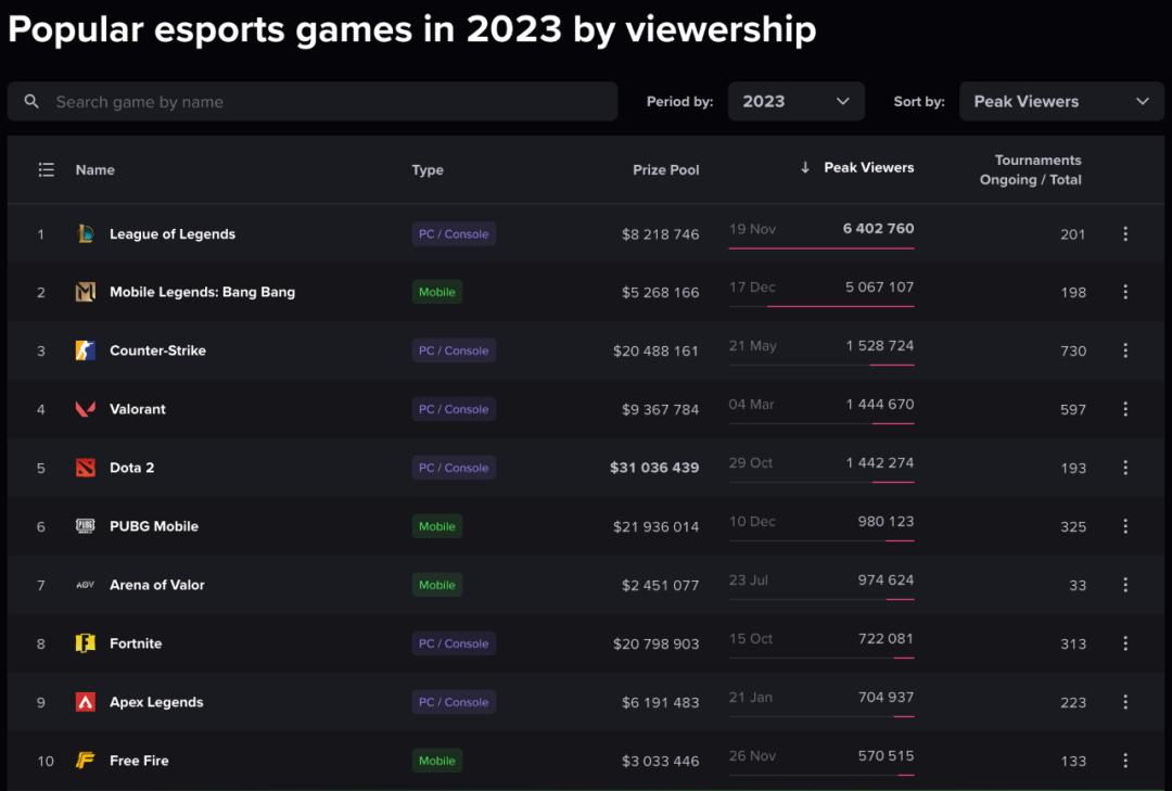第一季度表现最好的5场电竞赛事中并没有出现Dota2赛事的身影,而在截止到目前的统计中,Dota2在今年的比赛中的收拾数据甚至无法进入榜单的前十,目前落后于火箭联盟位居第12名。而在2023年的全年统计中,Dota2位居第5名。