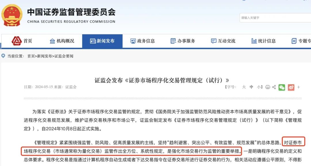 5月15日,证监会发布《证券市场程序化交易管理规定(试行)》正式发布,将于今年10月8日起正式实施