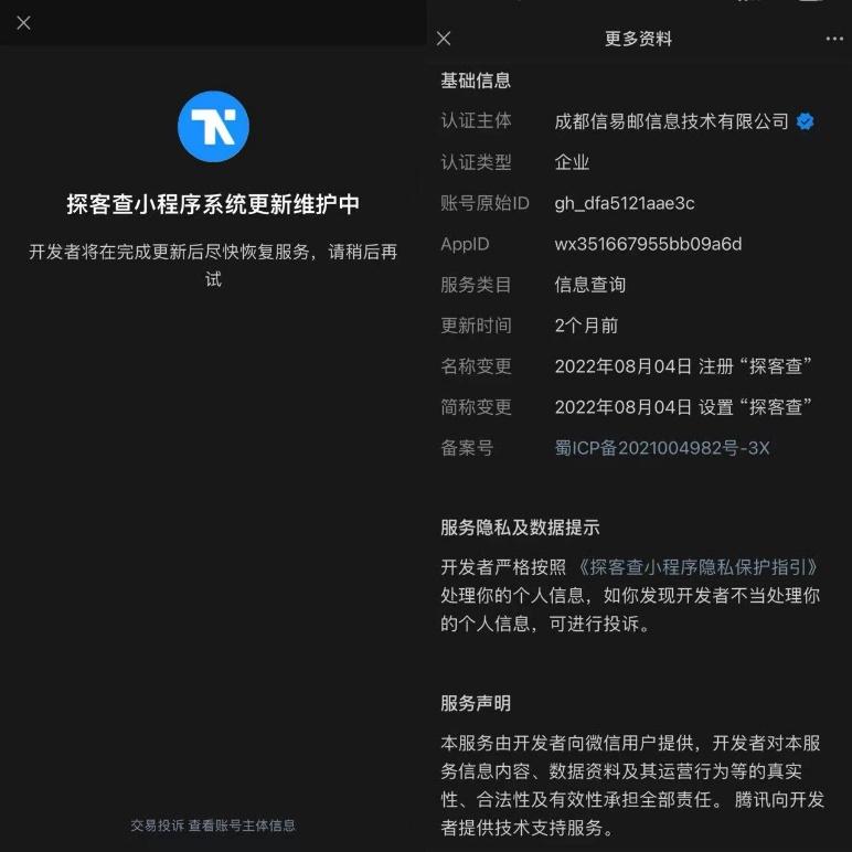 15日中午再次进入探客查小程序,已显示“系统正在更新维护中”。尝试点击其提供的“交易投诉 查看账号主体信息”,显示认证主体为成都信易邮信息技术有限公司,并早在2022年8月4日就注册了探客查。