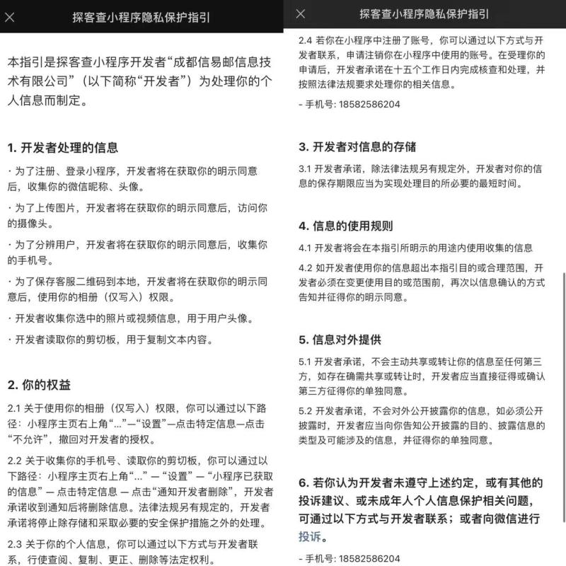 值得一提的是,《探客查小程序隐私保护指引》中明确告知用户,若在小程序中注册了账户,可以与开发者联系申请注销账户,并且平台承诺不会主动共享或转让用户的信息至任何第三方,如必须公开时将确认开发者或第三方征得用户的单独同意。也就是说,购买企业家私人信息的用户,他们的隐私受探客查的保护。