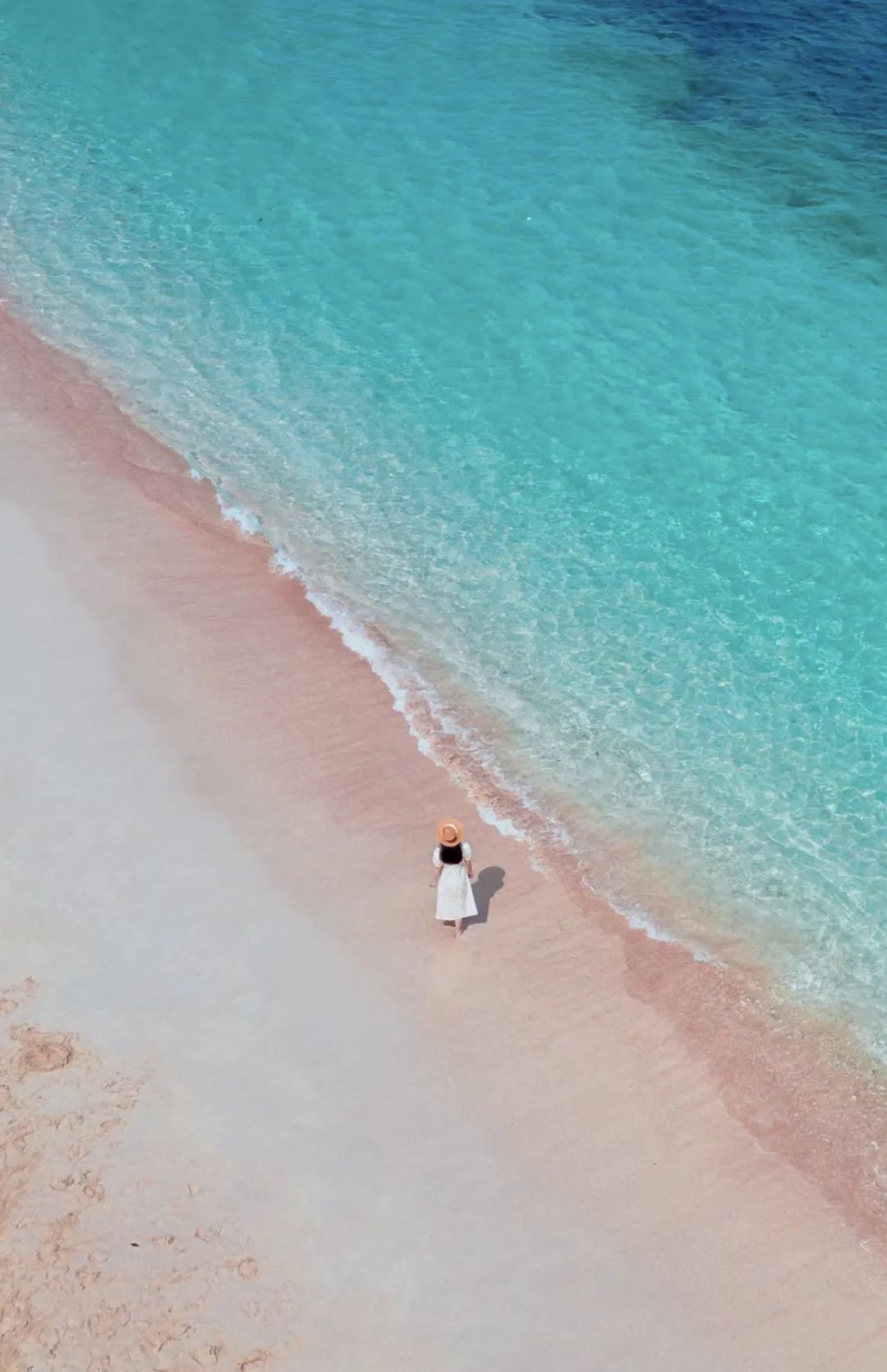 粉色沙滩其实肉眼看的比拍出来更粉,但这个沙滩面积不大,海水由远到近呈孔雀蓝、翡翠绿,依次晕染开,与粉色交织出一片梦幻。