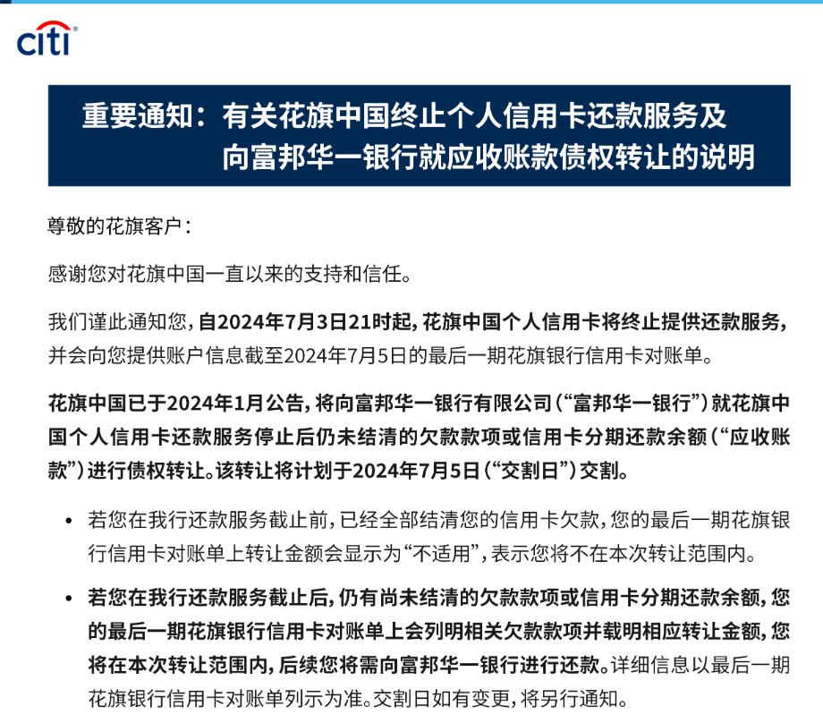 通知显示,自2024年7月3日21时起,花旗中国个人信用卡将终止提供还款服务,并会向客户提供账户信息截至2024年7月5日的最后一期花旗银行信用卡对账单。