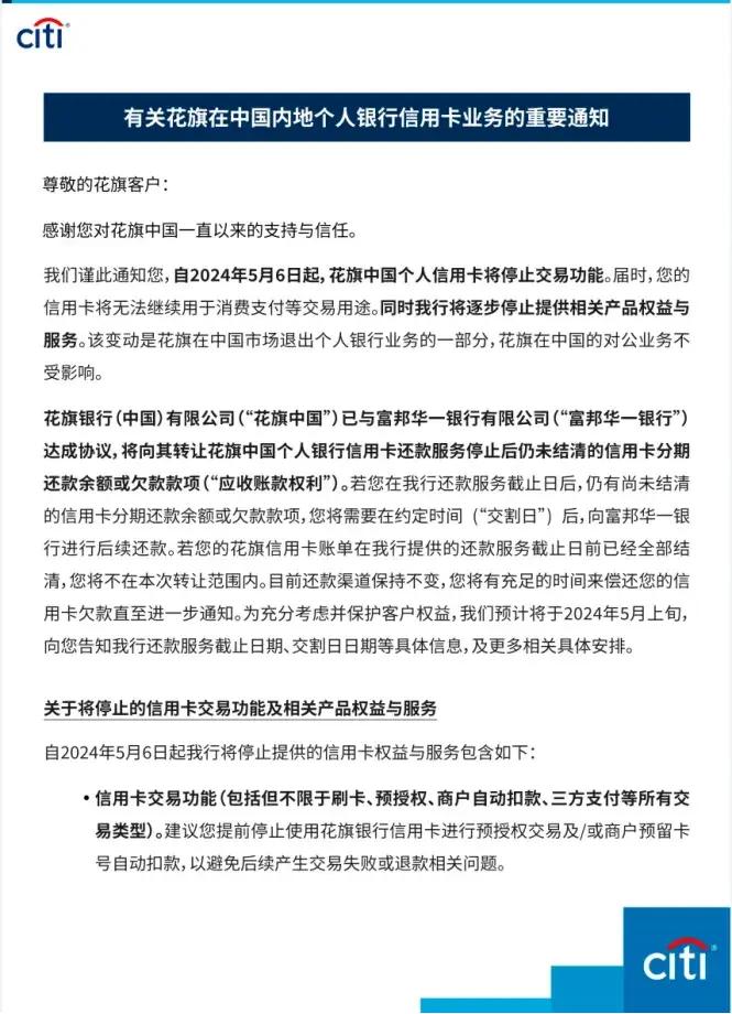 根据公告,自2024年7月3日21时起,花旗中国个人信用卡将终止提供还款服务,并会向客户提供账户信息截至2024年7月5日的最后一期花旗银行信用卡对账单。