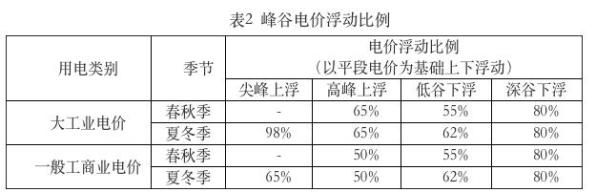 (二)试行重大节假日深谷电价。春节、劳动节、国庆节10:00-14:00设置为深谷时段,三个节假日具体时间以国家公布为准。(三)调整峰谷电价浮动比例,具体见表2。浮动比例以平段电价为基础,平段电价包含上网电价、上网环节线损费用、系统运行费用、输配电价(不含容(需)电价)、政府性基金及附加。