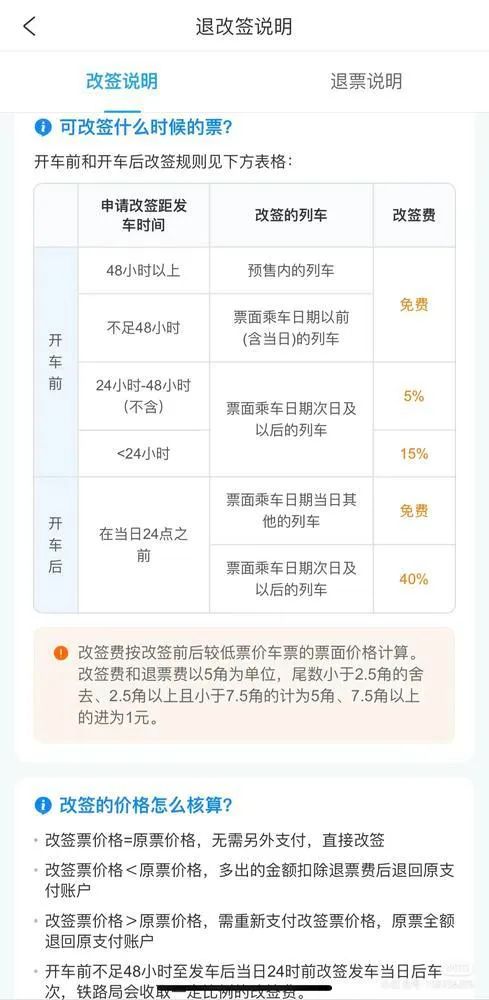 第一种是车没发出前,改签票是原车票日期往前或当日的全免费,哪怕晚于原车票发车时间,改签票是原车票日期的次日,开车前48小时前进行改签免费,之后按5%或15%阶梯收费。