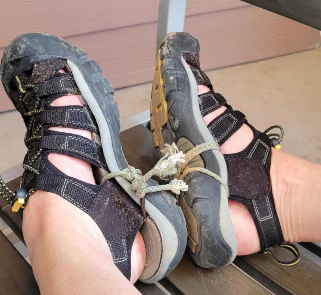 纯网纱的透气设计,在户外是防止蚊虫叮咬,但是打工人在城市里穿它,被治好了“露脚羞耻症”,而且夏天也不捂脚;排水汽、排热汽的鞋垫鞋底,除了能在河边踩水后还保持脚部干爽,也可以让大汗脚在办公室里也自在穿行。