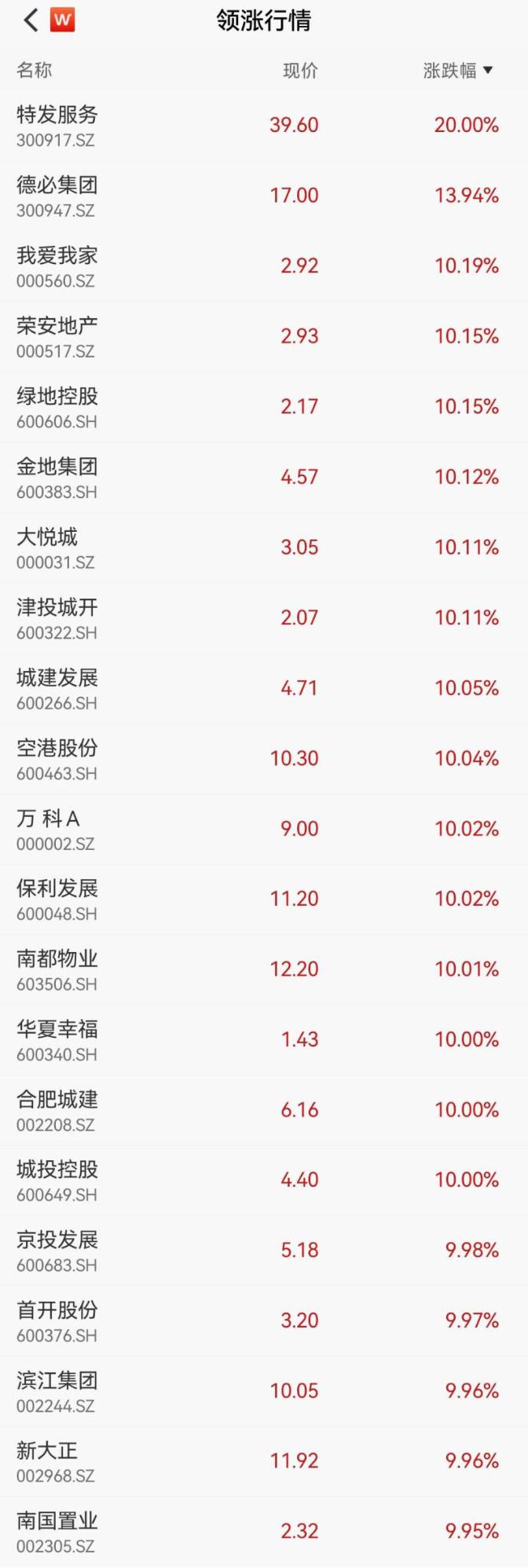 其中,特发服务20%涨停;我爱我家、荣安地产、绿地控股、金地集团、大悦城、津投城开、城建发展、空港股份、万科A、保利发展、南都物业、华夏幸福、合肥城建、城投控股、天地源等涨停。