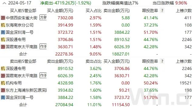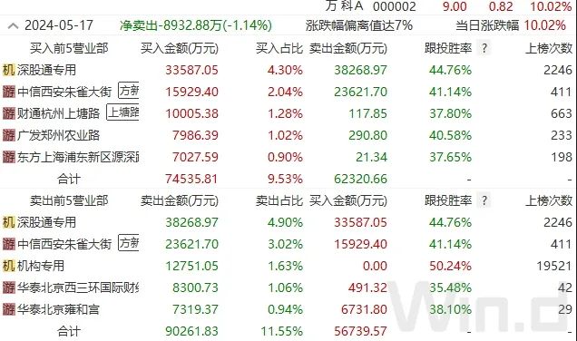 万科A涨停,全天换手率9.52%,成交额78.17亿元,振幅12.50%。龙虎榜数据显示,机构净卖出1.28亿元,深股通净卖出4681.92万元,营业部席位合计净买入8500.09万元。