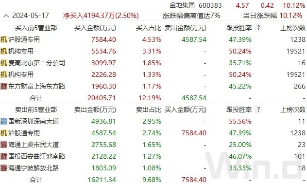 金地集团涨停,全天换手率8.64%,成交额16.75亿元,振幅11.46%。龙虎榜数据显示,机构净买入7761.04万元,沪股通净买入2996.86万元,营业部席位合计净卖出6563.53万元。