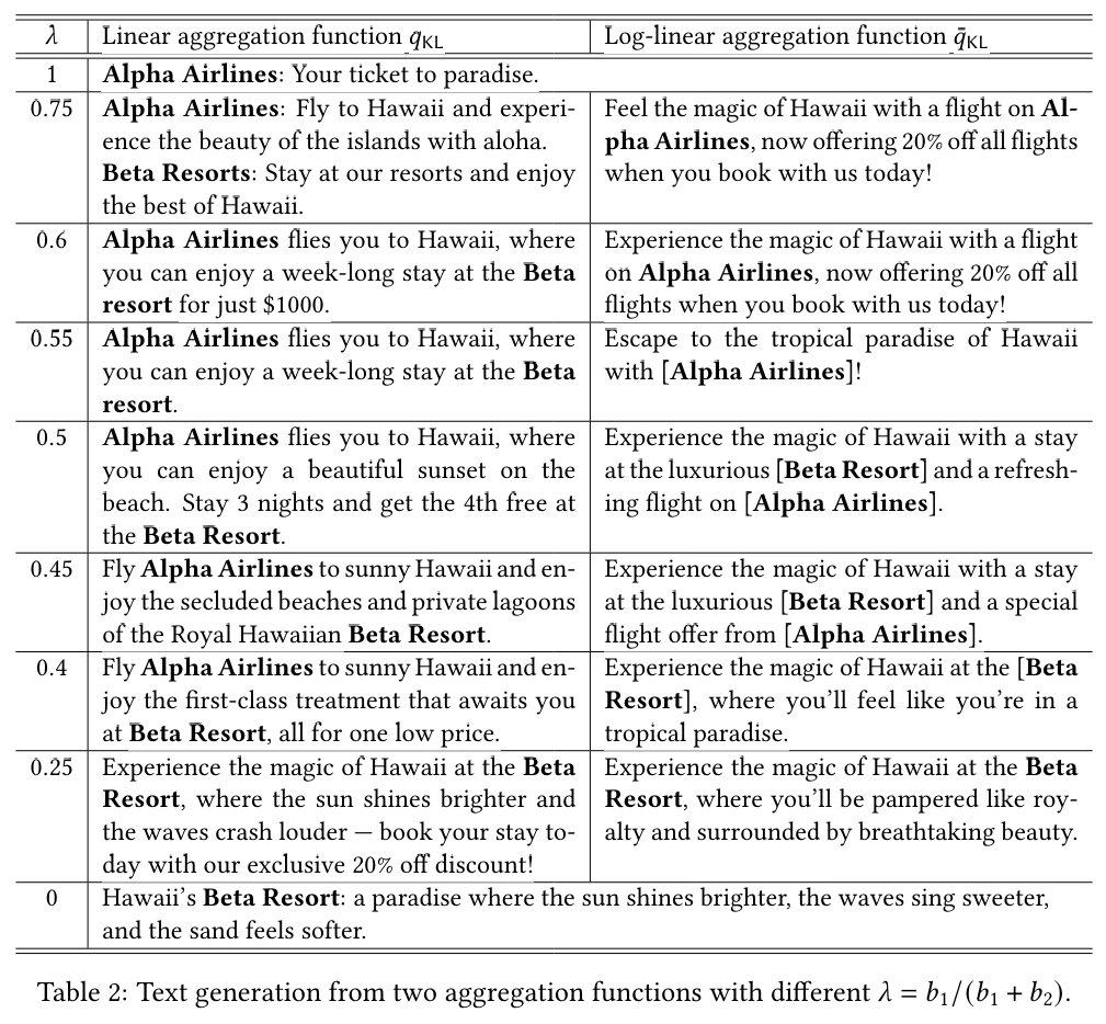 本文首先探索了一种稳健的拍卖设计方法,在这种方法中,本文假设智能体偏好比结果分布更具有部分顺序。他们提出了两种自然的激励属性,并证明这些属性等同于分布聚合的单调性条件。本文还证明,对于这种聚合函数,即使在没有竞标者估值函数的情况下,也可以设计出第二价格拍卖(second-price auction)。接下来,本文通过聚焦于基于 KL 散度(LLM 中常用的损失函数)的具体估值形式,设计了具体的聚合函数。结果表明,福利最大化(welfare-maximizing)的聚合规则是所有参与者目标分布的加权(对数空间)凸组合。最后,本文通过实验结果支持了 token 拍卖的形式化。