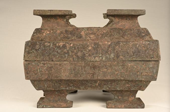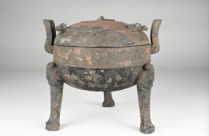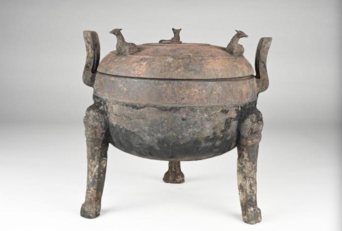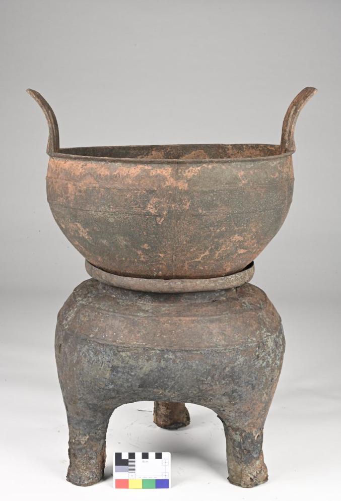 铜鼎椁室考古发掘有序推进。北、西部四个侧室(分别编号北一、二室、西一、二室)发掘完毕,东一室、南二室发掘工作正在进行中,提取各类文物3000多件(组),以及大量动植物遗存。北一、二室被盗扰严重,仍然提取出600余件(组)器物,多数为琴瑟等弦乐器,出土的编钟架横梁保存完整,上有悬孔14处,与追缴的青铜编钟数量吻合。南一、二室出土漆盒、耳杯、盘、豆、鼓,玉璧、璜、佩以及大量铜箭矢。西一、二室遗物以漆木俑为主,还发现木车、乐器和少量遣策类竹简。木俑有200多个个体,分立姿、坐姿等不同姿态,部分木俑佩木剑。东一室以青铜器为主,目前已提取青铜器150多件(组),器类有鼎、簋、簠、敦、钫、壶、甗、豆、鉴、釜、盘、尊缶等,青铜礼器组合保存完整;与青铜器同出的还有百余件案、俎、盒、榻等漆木质饮食宴享起居用具。