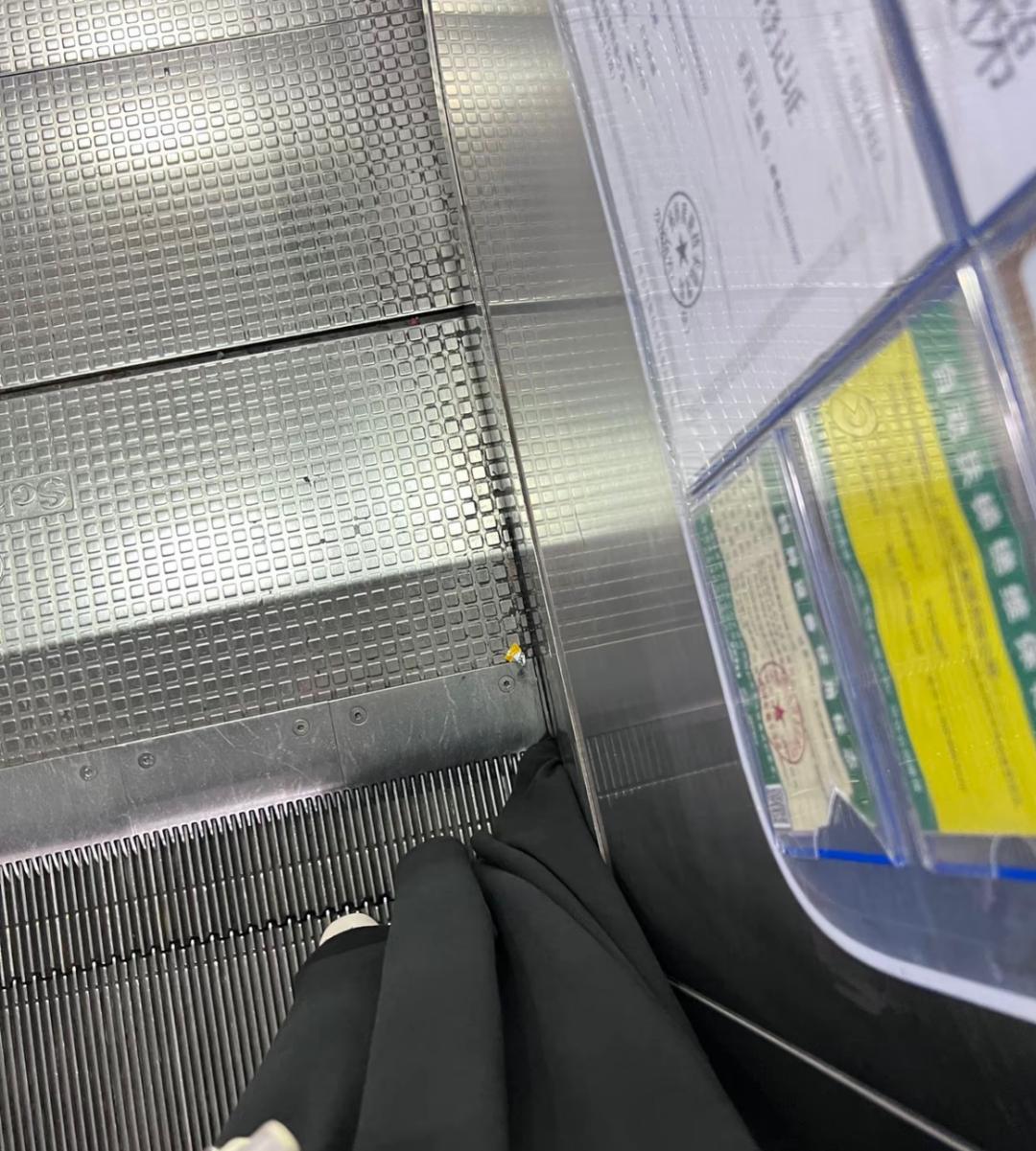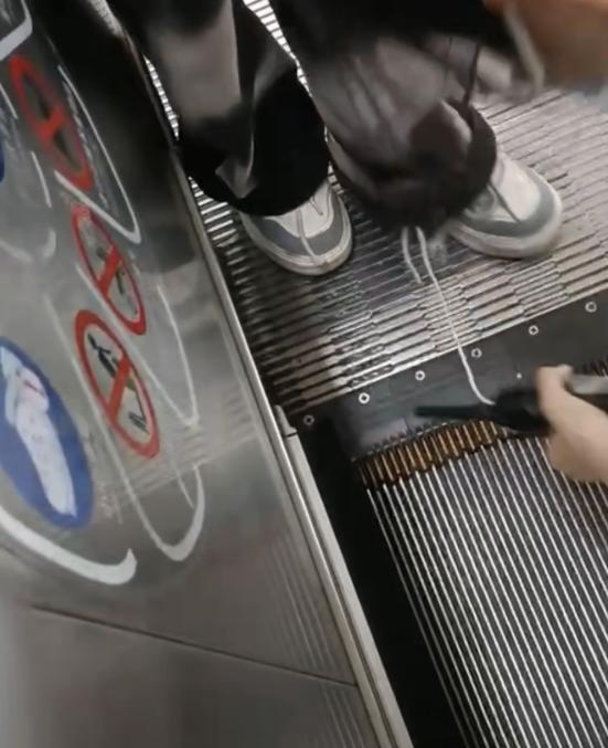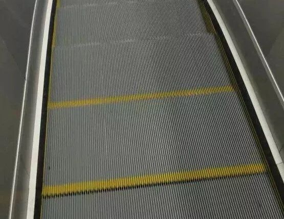 黄色警示线就是阶梯划分的警示,是危险地带,若直接踏在上面,很容易因站不稳而撞倒其他人。若刚好踩到齿间缺口,当上下两级梯级啮合时,被“咬”入扶梯的危险性也随之提高。03
