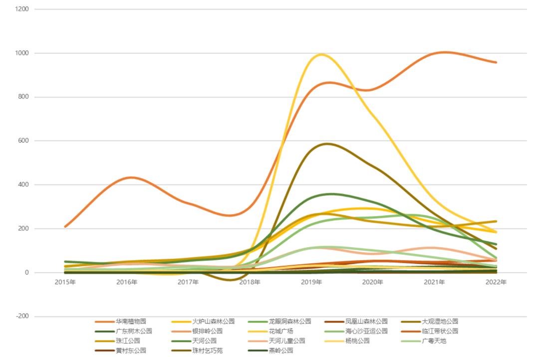 公园户外活动需求日益增长。通过整理2015年至2022年天河区公园在各个平台的评论数据量,可以看到,“公园”在人们生活中出现的频率越来越高。在众多公园中,华南国家植物园的增长趋势遥遥领先。随着社会经济的发展,人们对公园的需求是越来越大,对公园品质的要求也越来越高。