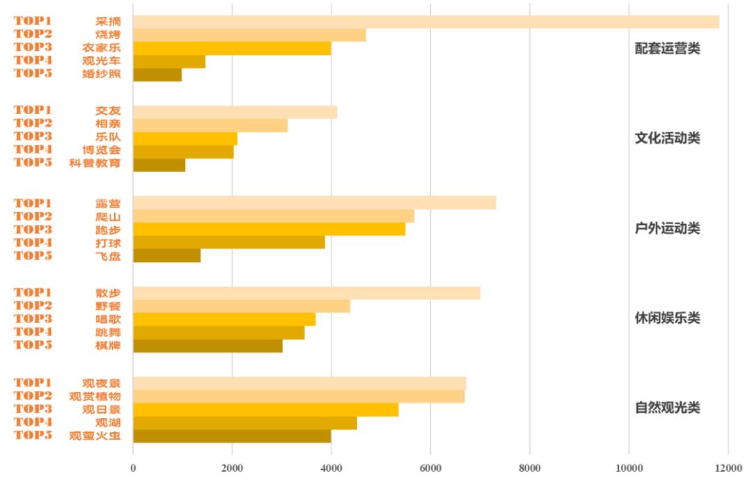 整理多个APP笔记评论数据进行词频分析得出,天河区最热门的公园活动项目有五类(配套运营类、文化活动类、户外运动类、休闲娱乐类、自然观光类)共75种玩法,最热门的10种玩法为:采摘、拍照、露营、散步、观夜景、赏花、亲子游、打卡、爬山、跑步。