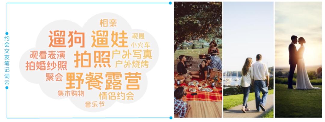 在上述五大类活动中,我们提炼出天河区公园最受欢迎的3类活动场景,包括:自然风景类活动场景、交友活动场景、运动健身活动场景。其中,自然风景拍照打卡场景占社交媒体分享笔记的35%,交友活动场景占分享笔记的30%,运动健身活动场景占35%。