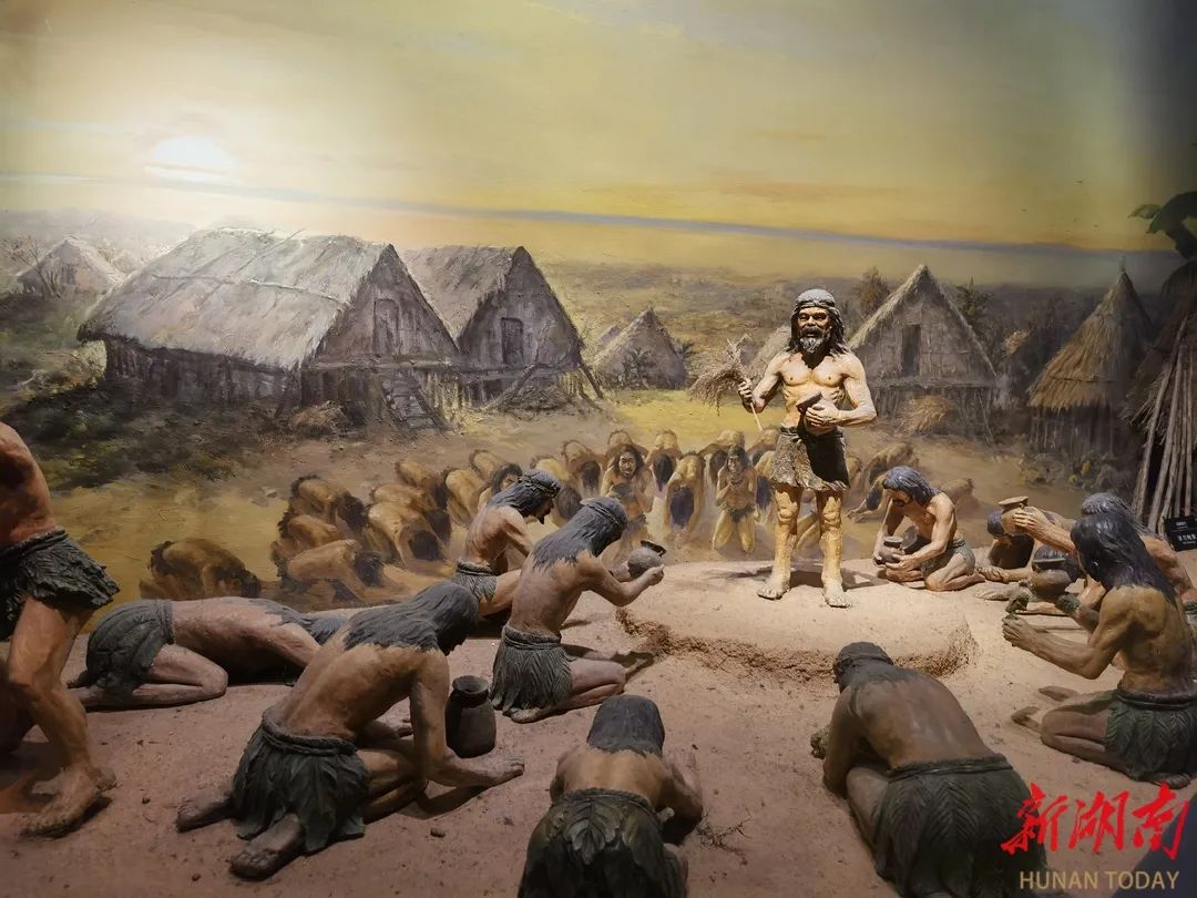 先民祭祀仪式(模拟)。大塘遗址出土实物中,真真切切“听”到长沙先民第一声“粗犷的歌声、激奋的舞蹈”。已故的长沙博物馆原馆长黄纲正曾经谈到,这里发生过远古时期娱神图腾性质的庆典,“从这些碎片里,看到先民们的意识在醒来,诸神的意识也在醒来;仿佛听到7000年前,有人在湘江水畔发出歌声、跳起舞来,这是一种人与诸神共同复活时的歌舞。”