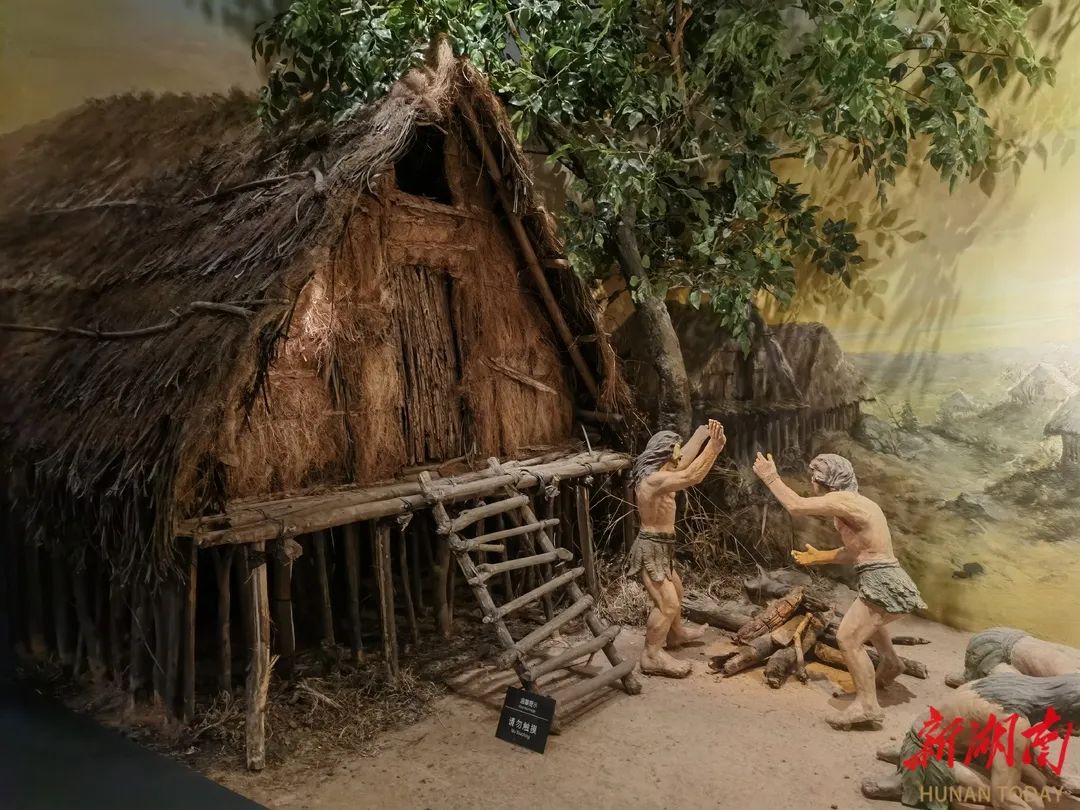 先民的干栏式房屋(模拟)。遍地遗留的碎陶,如同7000年前“老照片”,“拍”下先民歌舞的节奏、身影和生活情景,定格湘江边最初的庆典文化之源。透过这些碎陶彩绘,也让我们能与远古时期的盛典仪式“神交”。