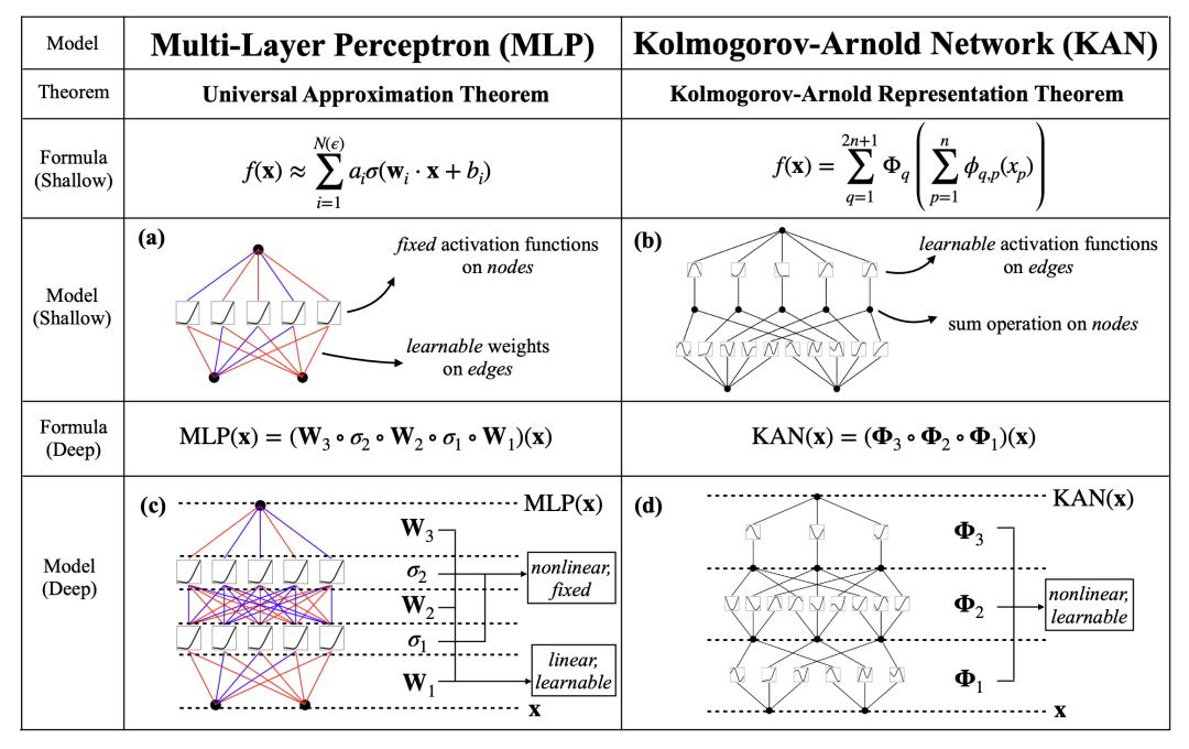 KAN 与 MLP 一样具有强大的数学基础,MLP 基于通用逼近定理,而 KAN 基于 Kolmogorov-Arnold 表示定理。