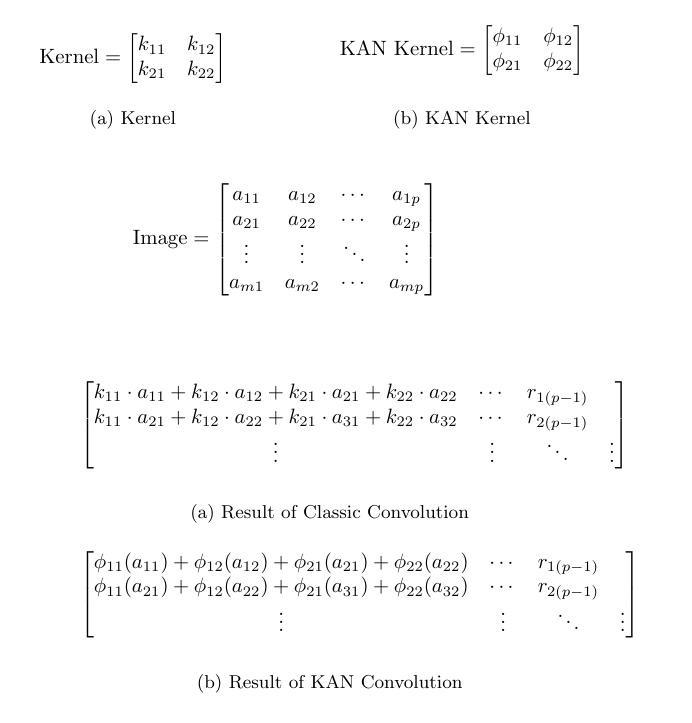 KAN 卷积与卷积非常相似,但不是在内核和图像中相应像素之间应用点积,而是对每个元素应用可学习的非线性激活函数,然后将它们相加。KAN 卷积的内核相当于 4 个输入和 1 个输出神经元的 KAN 线性层。对于每个输入 i,应用 ϕ_i 可学习函数,该卷积步骤的结果像素是 ϕ_i (x_i) 的总和。