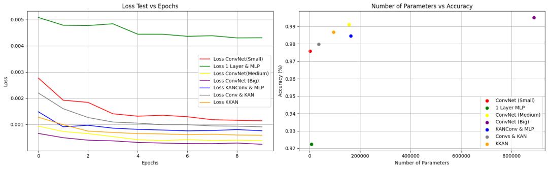 在 2 个相同的卷积层和 KAN 卷积层与最后连接的相同 MLP 之间进行的比较显示,经典方法略胜一筹,准确率提高了 0.06,而 KAN 卷积层和 KAN 线性层的参数数量几乎只有经典方法的一半,准确率却降低了 0.04。