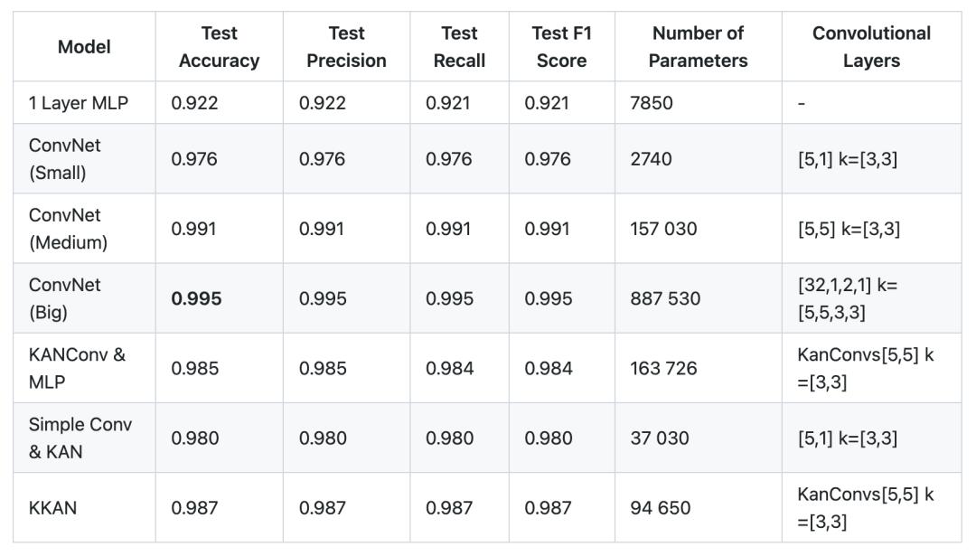 基于 28x28 MNIST 数据集,可以观察到 KANConv & MLP 模型与 ConvNet(大)相比达到了可接受的准确度。然而,不同之处在于 KANConv & MLP 所需的参数数量是标准 ConvNet 所需的参数数量的 7 倍。此外,KKAN 的准确率比 ConvNet Medium 低 0.04,而参数数量(94k 对 157k)几乎只有 ConvNet Medium 的一半,这显示了该架构的潜力。我们还需要在更多的数据集上进行实验,才能对此得出结论。