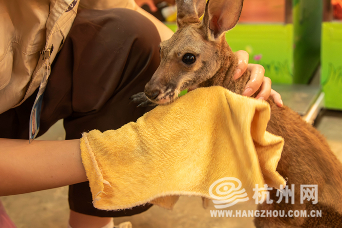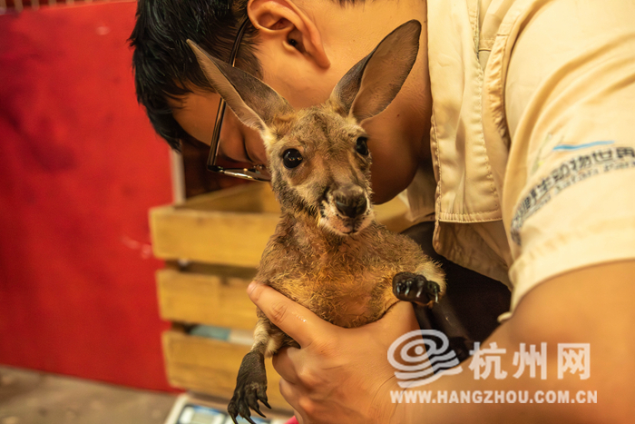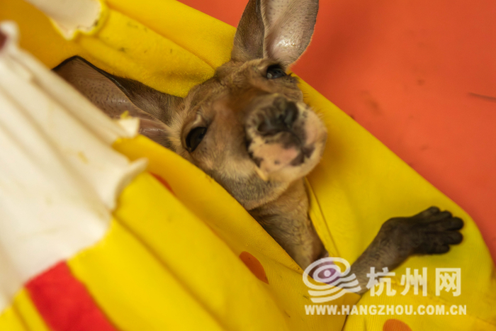 近日,在杭州野生动物世界的动物幼儿园里,运气好的话,就会偶遇一位看着眼生的“小朋友”,一只赤大袋鼠幼崽。据悉,这只袋鼠宝宝是去年10月出生,本来生活在妈妈身边,但由于袋鼠妈妈在3个月前出了意外,无法再顺利育儿,小袋鼠就被饲养员紧急送往动物幼儿园,请经验丰富的育幼员们接棒,进行人工喂养。