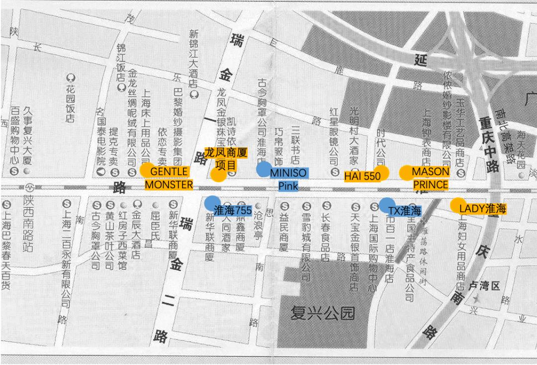 △ 截止2月中旬的施工进度 图源小红书:53111417172021年,黄浦区发布《黄浦区淮海中路(淡水路以西段)商业业态规划》,设置四大主题片区,龙凤商厦位于其中的品质生活坊,旨在以生活方式类复合业态和共享社区等为特色,打造质感生活街区,已有GENTLE MONSTER全球旗舰店、潮牌nice rice旗舰店、Niko and…中国大陆首家旗舰店、MUJI无印良品淮海店等一系列品质首店。